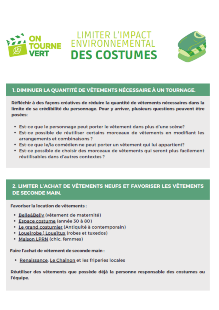 Developed by and for industry members, the following guides are available for free consultation and download. They are intended for all Quebec productions, regardless of their size and type, from variety shows to Hollywood blockbusters, and will provide concrete action steps and references to reduce their environmental impact.