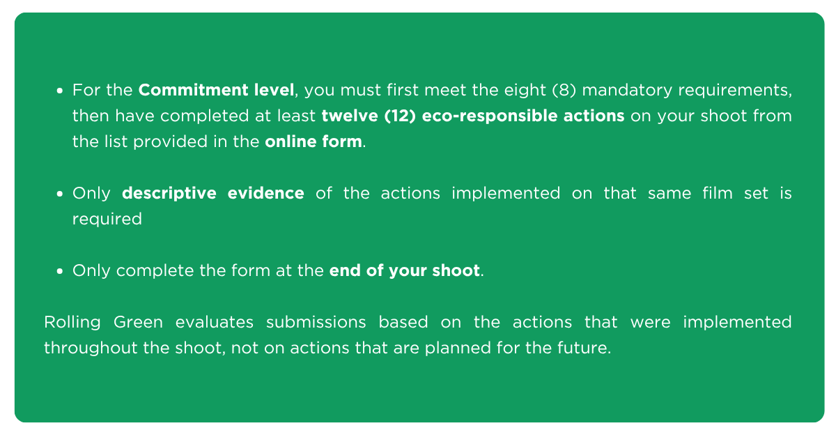 Considering the environmental impact of audiovisual productions, the Rolling green accreditation was developed to recognize eco-responsible productions in Quebec. It is addressed to film sets wishing to undertake and gain recognition for a sustainable development approach. The aim of the project is to promote and encourage the implementation of eco-responsible practices in audiovisual productions. To obtain Rolling green accreditation, productions must implement a series of eco-responsible measures on their set, and be able to demonstrate the actions taken.