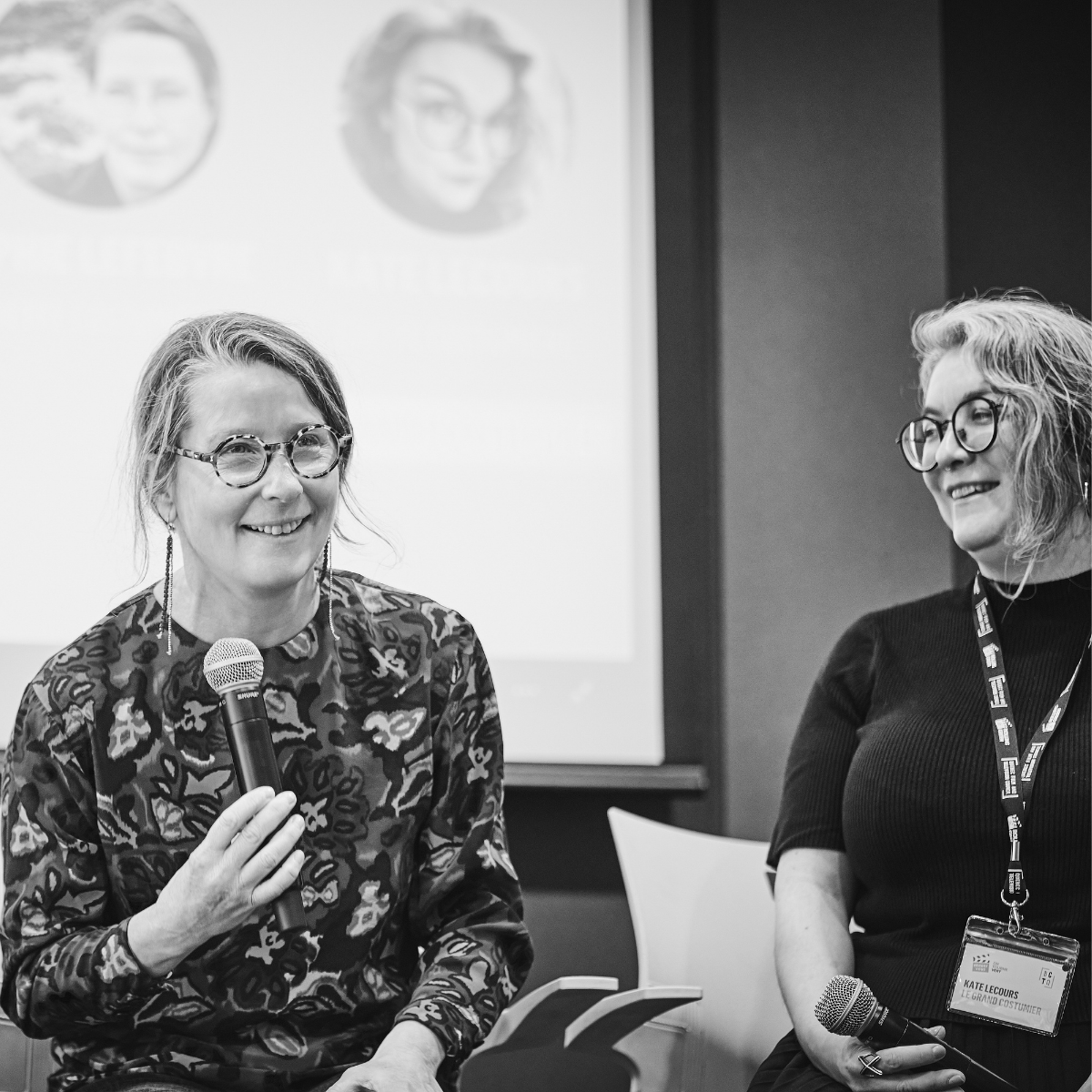 Le premier panel de la journée réunissait deux cheffes costumières, Kate Lecours (Le Grand Costumier) et Sophie Lefebvre, et Anaelle Nedelec (Unel), experte en mode responsable. Animée par Gautier Berlemont de la grappe industrielle Mmode, la discussion a interpellé sur l’impact environnemental grandissant du textile, nécessitant l’adoption de pratiques plus écologiques pour les costumes également. Nos expertes ont ensuite partagé leurs expériences et les défis rencontrés pour lier créativité et durabilité.